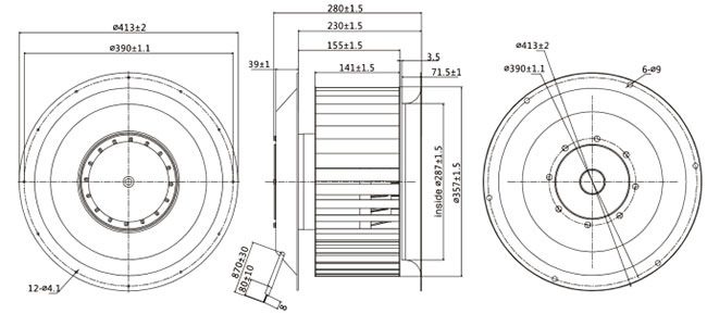1. 性能參數:風輪直徑355mm,由4極和6極額定電壓為230/400V,頻率50Hz三相異步運轉電機組成。最大風量分別為7000m3/h和4032m3/h,與之相對應的轉速為1400rpm和870rpm。
