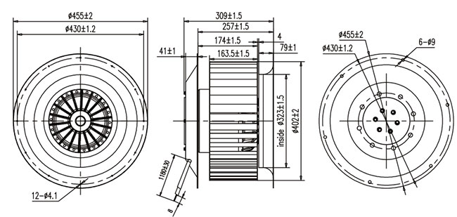 單進風前傾式離心風機根據風機外形可分為蝸殼前傾式離心風機和常規前傾式離心風機兩種。蝸殼前傾式離心風機共有120mm,133mm,140mm,150mm,160mm,180mm六種風機。常規前傾式有200mm,225mm,250mm,280mm,315mm,355mm,400mm,450mm八種風機。